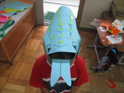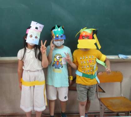 金曜日の1組の図工の様子です。アイディアあふれる工作になりました。紙の組み合わせは個性豊かで,お面だけでなく帽子を作って変身している人もいました。作品完成後も,休み時間に変身して遊んでいる人がたくさんいます!
