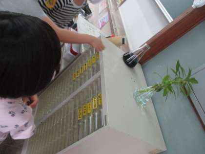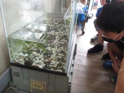 理科室の中で育てているメダカや植物の様子などを見ました。その中でも,オタマジャクシの水槽を覗いた時にはみんな目を輝かせていました。