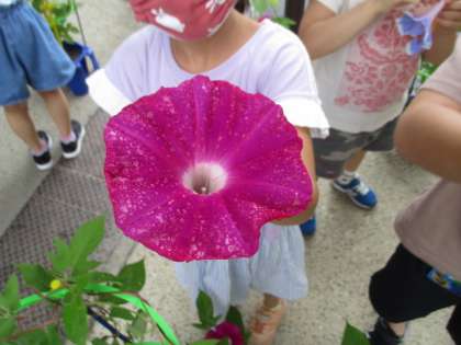 13日(月),生活科の時間にみんなでアサガオの花を集めました。紫や水色など,きれいな花が沢山咲いていましたが,夏休み明けにアサガオの花で色水を作るので,枯れてしまう前に摘んでおきます。