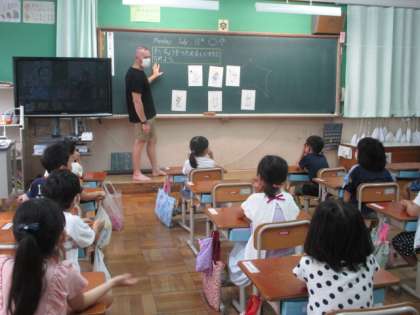 今日は,「up・dowm・right・left」の言い方を確かめた後,みんなでゲームをしました。クレーンゲームと同じ要領で,みんなで声を揃えて上下左右を言います。子どもたちの声を聞いて,ALTが手を動かします。キーワードの書かれたカードのところまで無事に辿りつけたら成功!というゲームです。