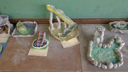粘土に水が流れるように形を作り,色水を流しました。