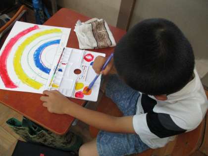 2組と同様で1組も「虹」を三色の絵の具をつかって塗りました。薄くなったり,思い通りにぬれなかったり,苦戦しながらも頑張っていました。