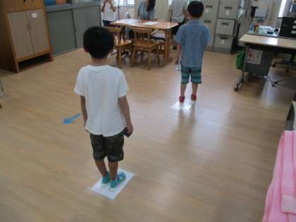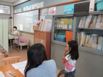 足型に並んで,1人ずつ検査をしていきます。始まる前は,「どうやってするの。」「どきどきする。」と話していた子どもたちですが,教室で,検査時の約束を聞いて,きちんときまりを守って検査を受けることができました。