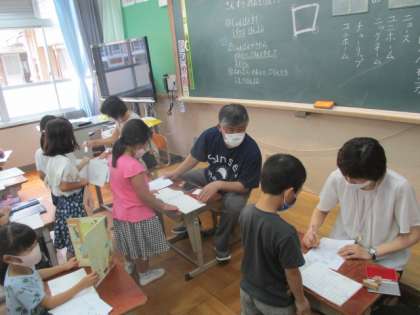 校長先生や教頭先生,教務の先生にノートを見てもらい,「きれいな字で書いていますね。」「めあてやまとめがきちんと書けています。」など,一人ずつコメントをもらって喜んでいました。