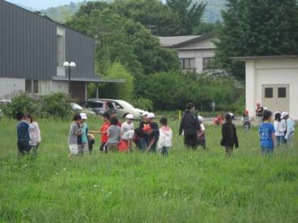 虫を採るのではなく、そーっと近づいて、何をしているかじっくり様子を観察しました。近くの草むらで、突然きじが飛び立ったときはみんなびっくり!きじの方も大勢の子ども達にびっくりしたのでしょうね。