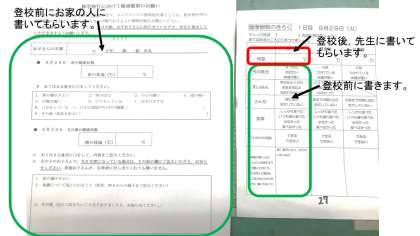 上の写真のように,しおりの体温以外のところは,登校する前に書いておくようにしてください。