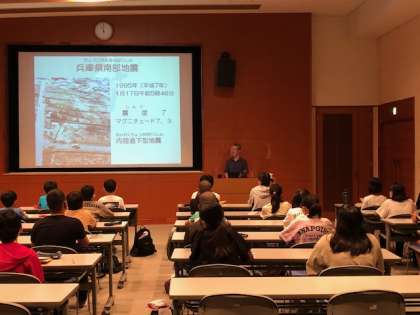 まずは語り部の方から,阪神淡路大震災について,お話を聴きました。当時の様子について,地震後に起きた火事のこと,阪神高速道路が倒壊したこと,自衛隊の救助やボランティアの様子等,詳しくお話をしてくださいました。また,災害は無くせないけれど減災はできるということや,防災の基本(自分の命は自分で守る)についても教えていただきました。