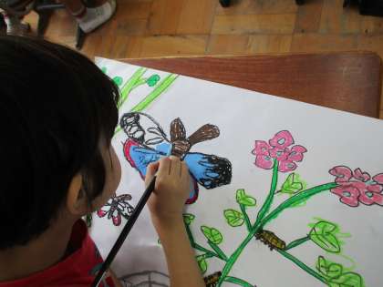 2組では,『アサギマダラの手紙』というお話の絵を描きました。アサギマダラというチョウは,日本から遠い香港・台湾までも飛ぶことができるチョウだそうです。「あさぎ色」をしているので「アサギマダラ」と言われるそうです。