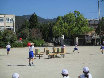 2日(金),2年生はスポーツフェスティバルのリハーサルを行いました。写真は,最後の競技の「なげあそび」の様子です。ボールを投げて,倒した段ボールの数を競う競技です。力を合わせて楽しみながら取り組んでいます。