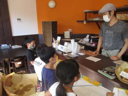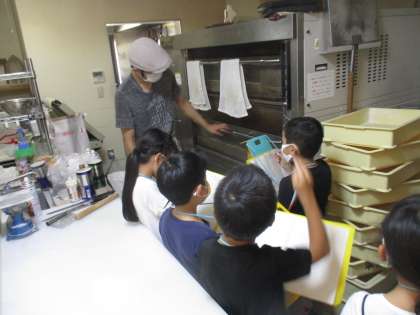 パン屋さん(パン・ド・キ)では,おいしいパンがどのように出来ているのかを教えてもらいました。パンが焼ける前の生地の大きさはとても小さく子どももびっくり!また,パンを焼く機械は,とても大きいものがあることを知りました。