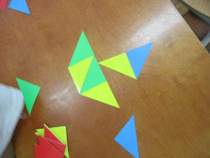 「小さな三角形を組み合わせると,大きな三角形ができるよ。」「他にもどんな形ができるかな。」と話していました。明日は,自分で色板を自由に動かして,どんな形ができるかみんなで考えたいと思います。