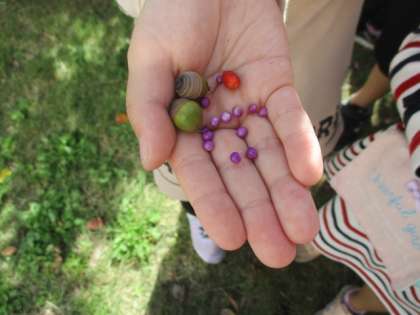 「見て見て!小さいどんぐりは,飾りに使えそう。」「こんな紫色の実は初めて見たよ。かわいいな。」と,リースに合うものをたくさん発見して,どの子も楽しそうに活動していました。