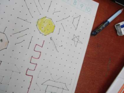 20日(火),算数の学習で,点と点をつないで,作りたい形を考えました。ケーキや花火,お城など,工夫して作ることができました。