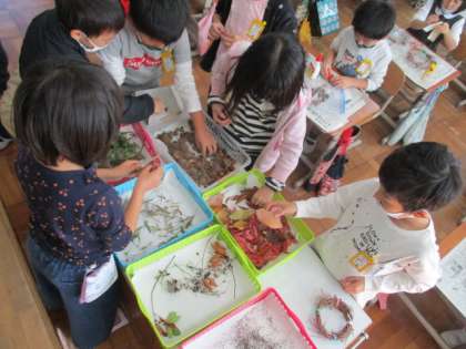 秋の木の実やどんぐり,まつぼっくりを使って,丁寧に飾りつけをしていきます。「葉っぱを重ねたらきれいだね。」「どんぐりの帽子をつけたらかわいいね。」と話しながら活動していました。