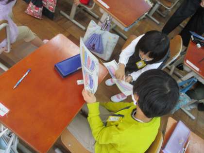 好きな色でちょうちょを塗り,自分が選んだ色を友だちに紹介する活動を行いました。「Blue, Orange, Pink, and Green.」「Red, Purple, Yellow and Black.」など,好きな色をペアで友だちに伝える練習をした後,クラス全体でも紹介し合いました。