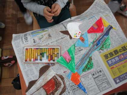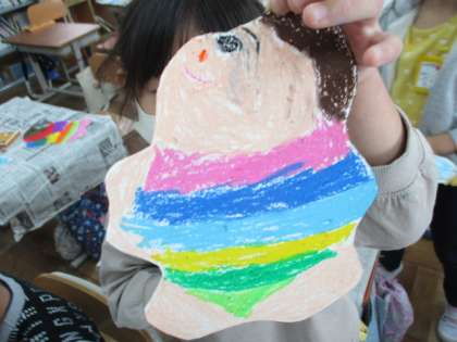 いろいろな紙の中から好きな紙を選び,何の形に見えるか友だちと話し合いました。「恐竜みたい。」「魚の形に見えるよ。」「顔に見えてきた。」と,どんどんイメージを膨らませることができました。パスを使って,画用紙いっぱいに思いついたものを表現することができました。