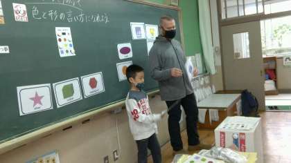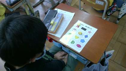 取り組んだのは,「ボンゴゲーム」。アンディー先生が好きなものを尋ねながら,どの色と形のことを言われたのかを,一生懸命聞いていました。五角形や六角形,八角形という難しい言い方も覚えて,ゲームを楽しんでいました。