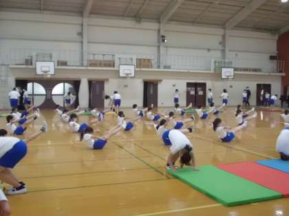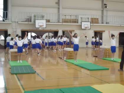 前半,とび箱・マットシンクロの様子です。隣の友達と息を合わせて,技をシンクロさせています。自分の技がうまくいくか…ドキドキしながら,リズムに合わせてとんでいます。