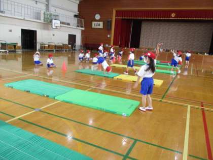 川とびやかえるの足うちなど,いろいろな技を繰り返し練習していきます。「腰を高く上げるといいよ。」「足の裏で,思いっきりマットを蹴ると上手にできるよ。」と,友だちにコツを教えることができました。
