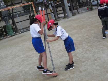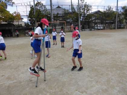 体育で遊具を使っての活動をしました。竹馬をもって「これできひんわ」「かんたんやしやってみよ」という声でもちきりでした。やっぱりできると嬉しいです。遊具は工夫して使うことで楽しさが広がります。コロナ禍であるからこそ工夫した遊びを今後も沢山してほしいです。