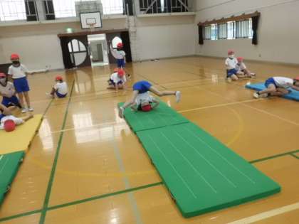 今日のめあては,連続で技をする感覚をつかんだり,技を組み合わせる感覚をつかんだりすることでした。久しぶりのマット運動を楽しむ子どもたちの様子が見られました。