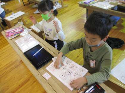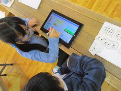 リズムカードを組み合せ,自分の思いにあったリズムになっているかどうかを,プログラミングで確かめました。カードを並びかえて,いろいろな音楽をつくっては確かめ,楽しみながら取り組んでいました。