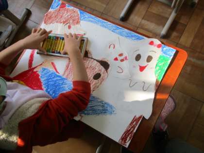11日(水),図画工作の時間に,前回の学習でかいた絵を画用紙に貼って,周りの様子を考えながらパスで絵を描き足していきました。