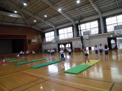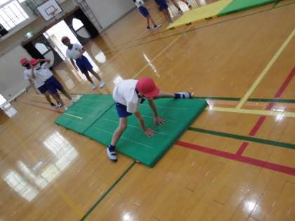 マット運動の学習が始まりました。この季節になると,手足が縮こまってしまいす。こんなときこそ,準備をしっかりして,安全に取り組みます。前転から側方倒立回転(通称:側転)までやってみました。つぎからは連続技に挑戦です。