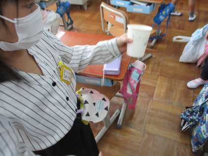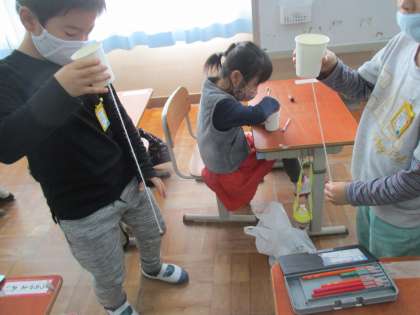 どんぐりやまつぼっくりなど,運動場で拾ってきたものを使ってどんな遊びができるか考え,どんぐりごまやまつぼっくりのけん玉などを作ることができました。