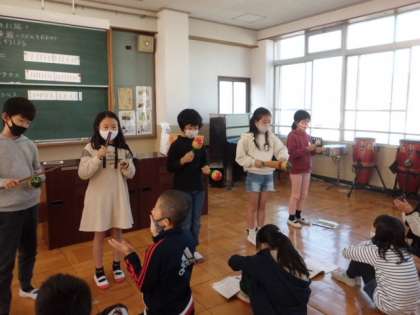 「いろんな木の実」という曲に合わせて,ギロ,クラベス,マラカスの演奏をしました。今まで手拍子で取り組んでいましたが,初めて楽器を触って,子どもたちは,戸惑いながら,一生懸命演奏をしていました。