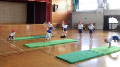 マット運動をしています。側方倒立回転ができるようになるために,壁をつかっての倒立の練習もしていきます。オリンピック選手のようにつま先から指先まで美しい体操をイメージして活動しています。