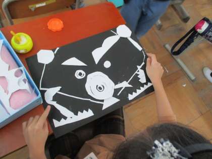 切れた形からイメージしたことを思い浮かべ,黒画用紙の上に並べました。どんなものに見えるか,想像をふくらませながら,紙の置き方や並べ方を工夫していました。
