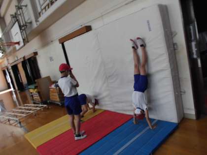 昨日は壁倒立に挑戦しました。「倒立はお腹と背中に力いるわ」「バランスが難しい」と話していました。