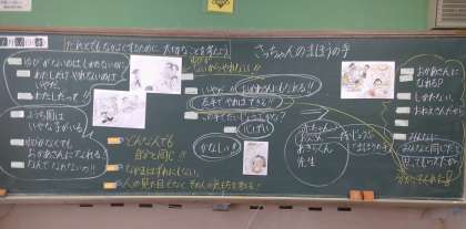 20日(水),「さっちゃんのまほうの手」を読んで,だれとでも仲良くするために大切なことについて考えました。この学習は,参観日で保護者の方にも見ていただく予定にしていた学習です。