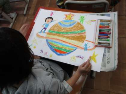 前回の学習では,乗ってみたいものと自分を絵に表しましたが,今回は周りにいるものを描き足したり,背景を塗ったりしました。「海の中だから,青がいいかな。」「夕焼けの色みたいに,紫がいいかな。」と,それぞれに合う色を考えて,背景を塗ることができました。
