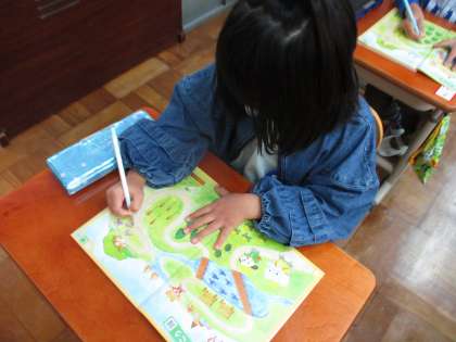 教科書の絵を見て,お花や鳥など同じもの同士を丸で囲み,いろいろな仲間がいることに気づきました。