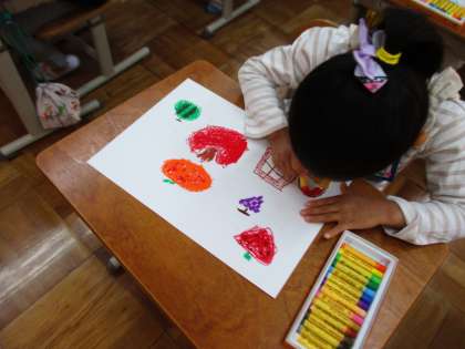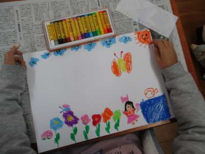 子どもたちは,パスを使って思い思いの絵を描くことができました。友だちと完成した絵を見合い,「お友だちの絵がきれいでした。」「ぼくと一緒で,桃が好きな友だちがいました。」と話していました。