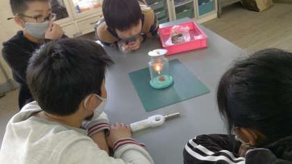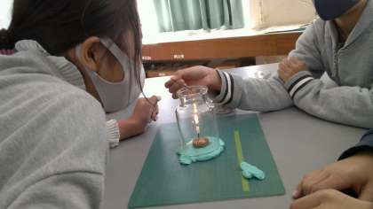 19日(月),理科では「ものの燃え方」の学習をしています。理科は,専科の久津間先生に教わっています。今日は,ものが燃え続けるにはどうすればいいのか,考えて実験しました。ビンの蓋を閉めると・・・あれ!?「火が消えました!!」とびっくり!火の様子を真剣に,集中して観察しいるようでした。実験の結果,蓋を開けるとろうそくの火が燃え続けることから,ものが燃えるには,新しい空気が必要なことが分かりました。