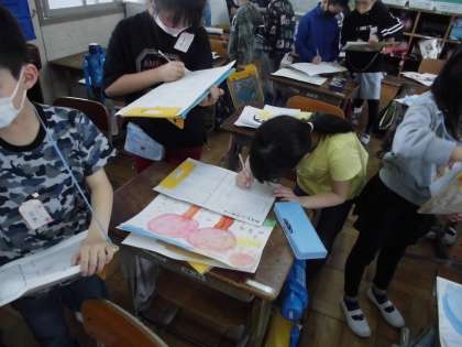 20日(火),先週描いた作品の鑑賞会をしました。友だちの作品を見ながら,「爆発しているみたいな描き方で素敵だね!」「色がきれい!」など自分が感じたことを鑑賞カードに書きました。