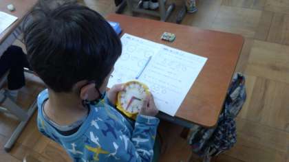 時計を使って,針の動きを確かめながら,「1時間は60分」「1日は24時間」「30分後には何時何分かな?」ということを学習しています。