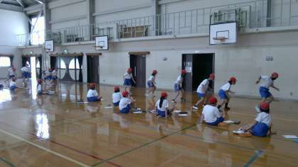 種目は,「反復横跳び」。子どもたちは,線を見ながら一生懸命記録を伸ばせるように体を動かしていました。