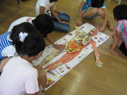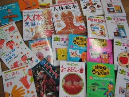 からだに関する絵本や、エイズ・感染症の本、インターネットや携帯から身を守る本など、様々な種類の本に子どもたちは興味津々です。休み時間には、さっそく手にとって読んでいる姿が見られました。なかでも、飛び出したりめっくたり出来る人体絵本が大人気です。