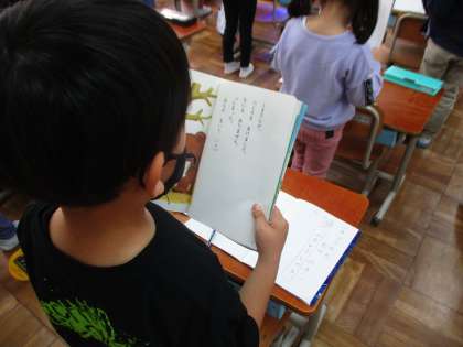 学習の1時間目には,「どうして最後に花の道ができたのかな。」「たくさんの動物が出てきたね。」と,それぞれに感じたことや気が付いたことを発表することができました。また,みんなで声をそろえて音読をしたり,挿絵を見ながら話し合ったりしました。