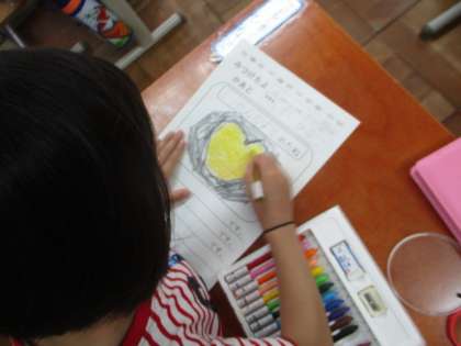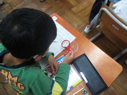 マリーゴールドやフウセンカズラなど,4種類の中から1つを選んで,虫眼鏡を使ってじっくりと観察しました。「ここが,でこぼこしているよ。」「ハートのもようが可愛いね。」と,気づいたことを話していました。