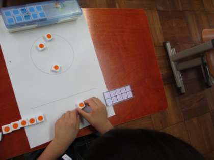 21日(金),算数科で「いくつといくつ」の学習をしました。数図ブロックをはじいて,枠の中に入った数を友だちと競いました。