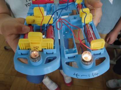 本日も理科では乾電池を用いての実験を行いました。今日は豆電球に明かりをつけて電池1つと2つの時とを比べてみました。すると「あっ,ついた。」から「あっ,ちがう。」という声があがり,「見せて,見せて。」と比べ合いが始まりました。豆電球の明かるさの違いはいったい何なのでしょうか。不思議を探っていきます。