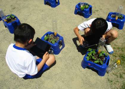 あさがおの観察を行いました。先週までは双葉だけだったものが,本葉も出はじめています。本葉にはふさふさの細かい毛が生えていたことを発見し,子どもたちは驚いていました。