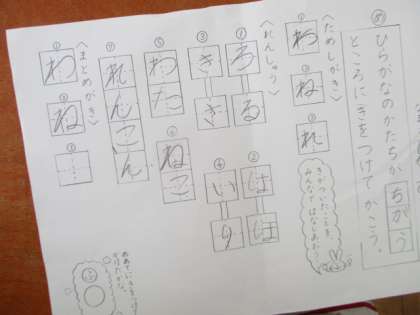 「わ」「ね」「れ」の3文字を比べて,どこが似ていてどこが違うかみんなで話し合いました。一画目と二画目のバランスが難しい字ですが,お手本を見ながら一生懸命に書いていました。他にも「ろ」と「る」,「い」と「り」など,似ているけれども少し違う字をひらがな表から見つけ,形に気つけてワークシートに練習することができました。