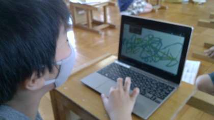 今回はGIGA端末でアプリを用いて,音作りをやってみました。音が絵になる,逆に絵が音になるなどの変化が楽しく,小さなアーティストがたくさんいました。
