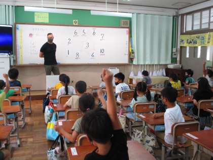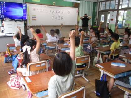 ALTの数字の数え方(指の折り方)を見て,「日本の数え方と違う!」「1は,親指を立てるんだね。」と,真似しながら数えていました。
